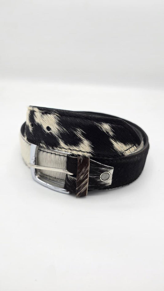 Handmade Black & White Cowhide Leather Belt – Hair-On Hide with Silver Buckle