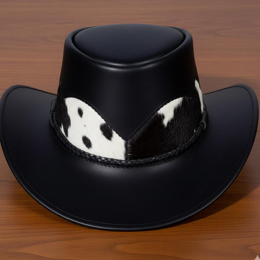 Handmade Black Leather Cowboy Hat Cow Print Band – Western Rodeo Style