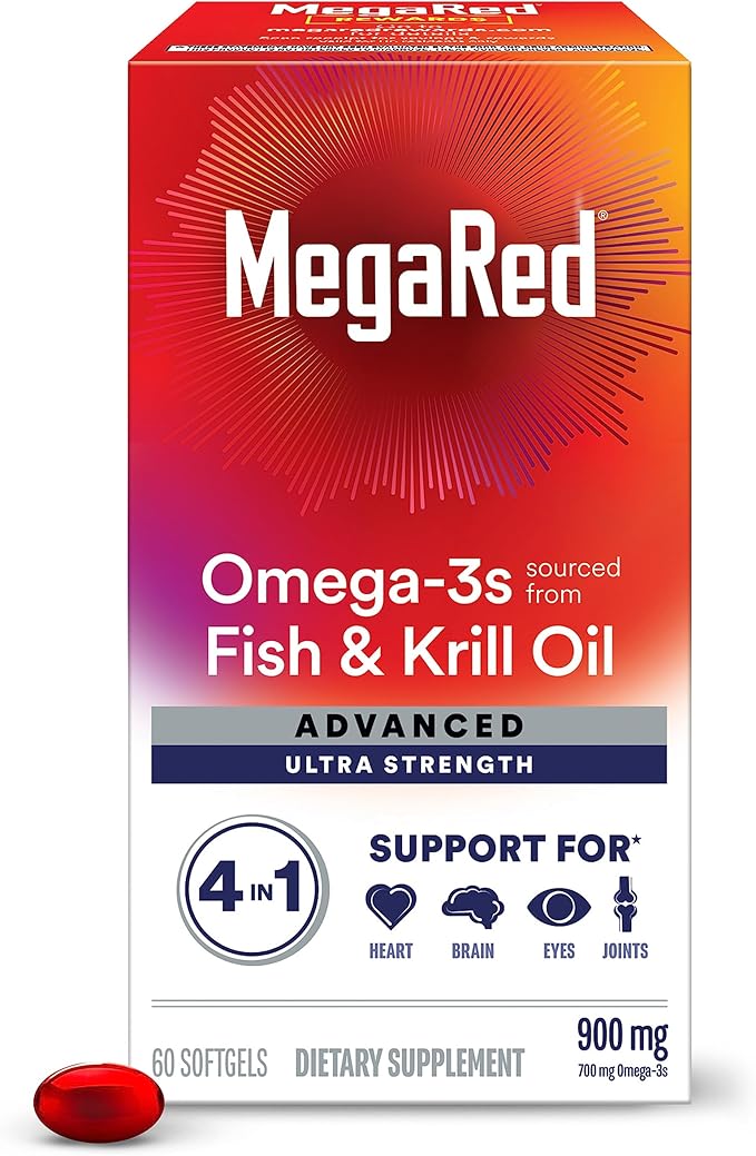 Support your daily wellness with Megared Omega-3 Fish & Krill Oil 900mg, an advanced 4-in-1 formula designed to promote heart, joint, brain, and eye health. With 2x more Omega-3s, this powerful blend delivers enhanced nutritional support in easy-to-swallow softgels.